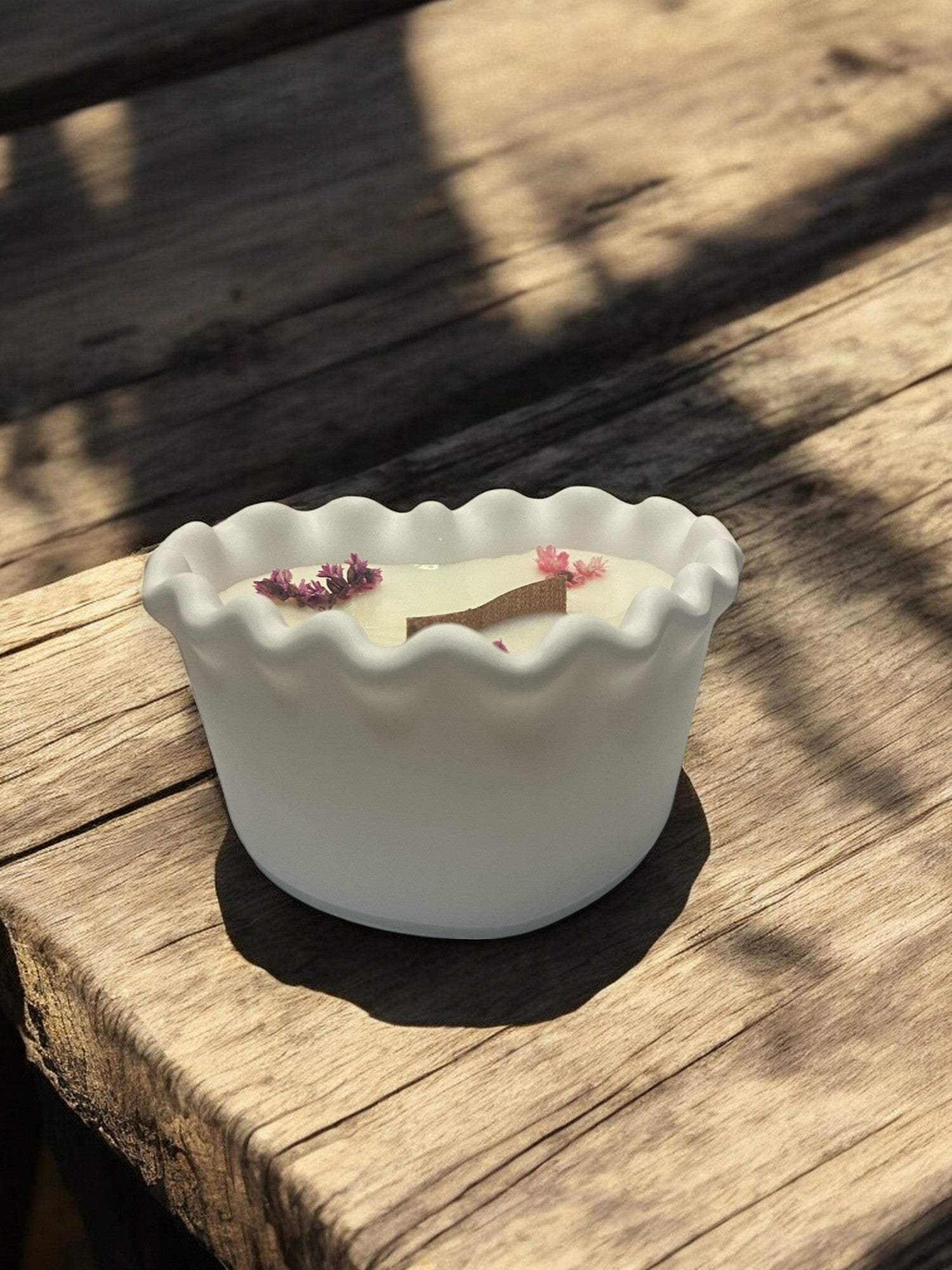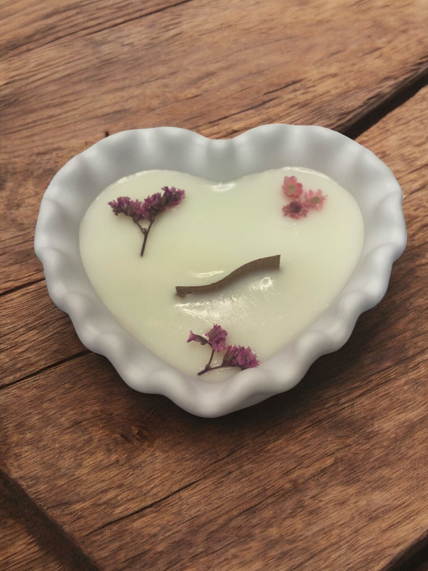 Vela de corazón con flores. Fragancia: Explosión de Flores. Flores decorativas y mecha de madea ondulada.
